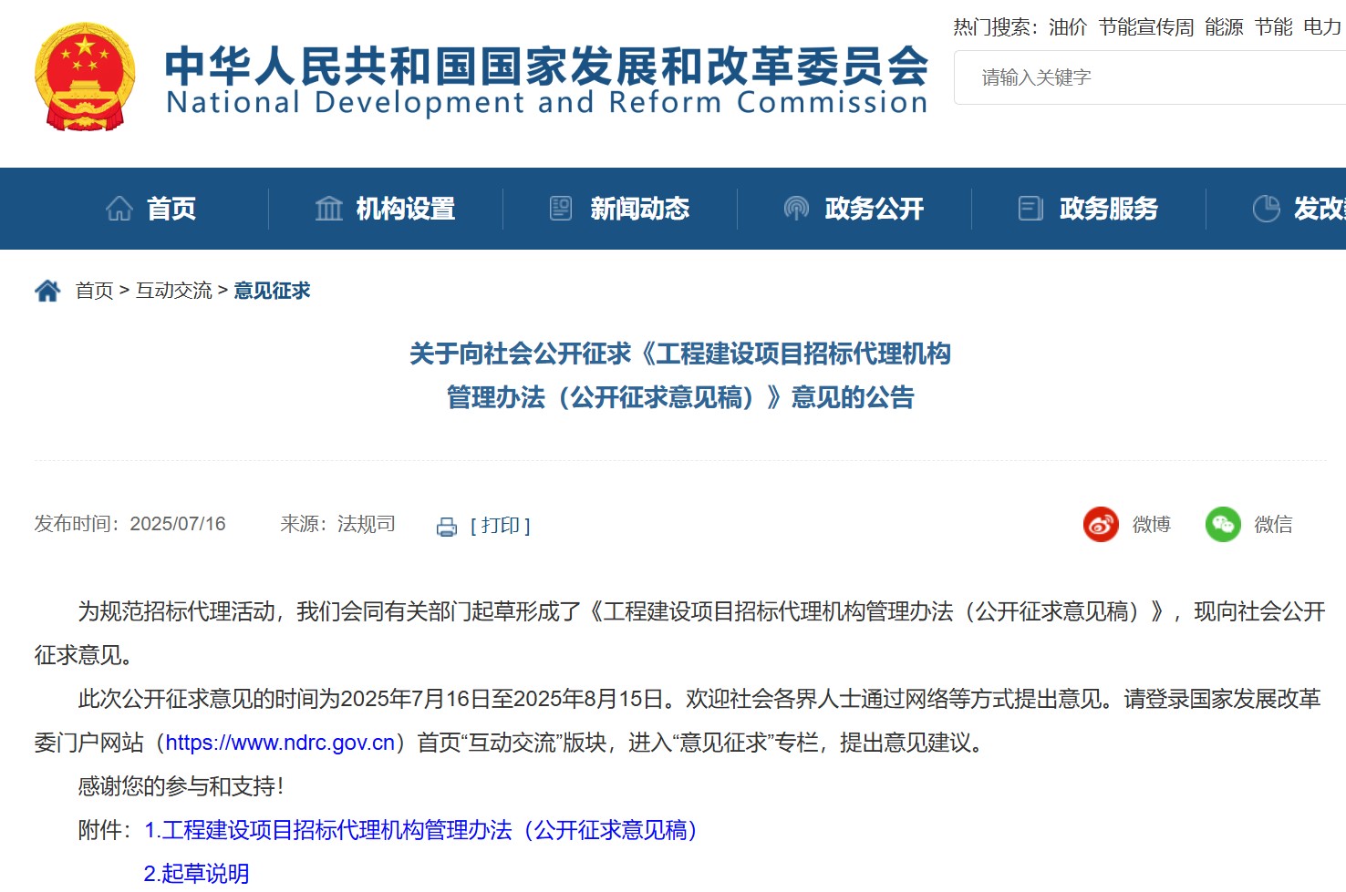 為規(guī)范招標(biāo)代理活動,國家發(fā)展和改革委員會會同有關(guān)部門起草形成了《工程建設(shè)項(xiàng)目招標(biāo)代理機(jī)構(gòu)管理辦法(公開征求意見稿)》,現(xiàn)向社會公開征求意見。此次公開征求意見的時(shí)間為2025年7月16日至2025年8月15日。